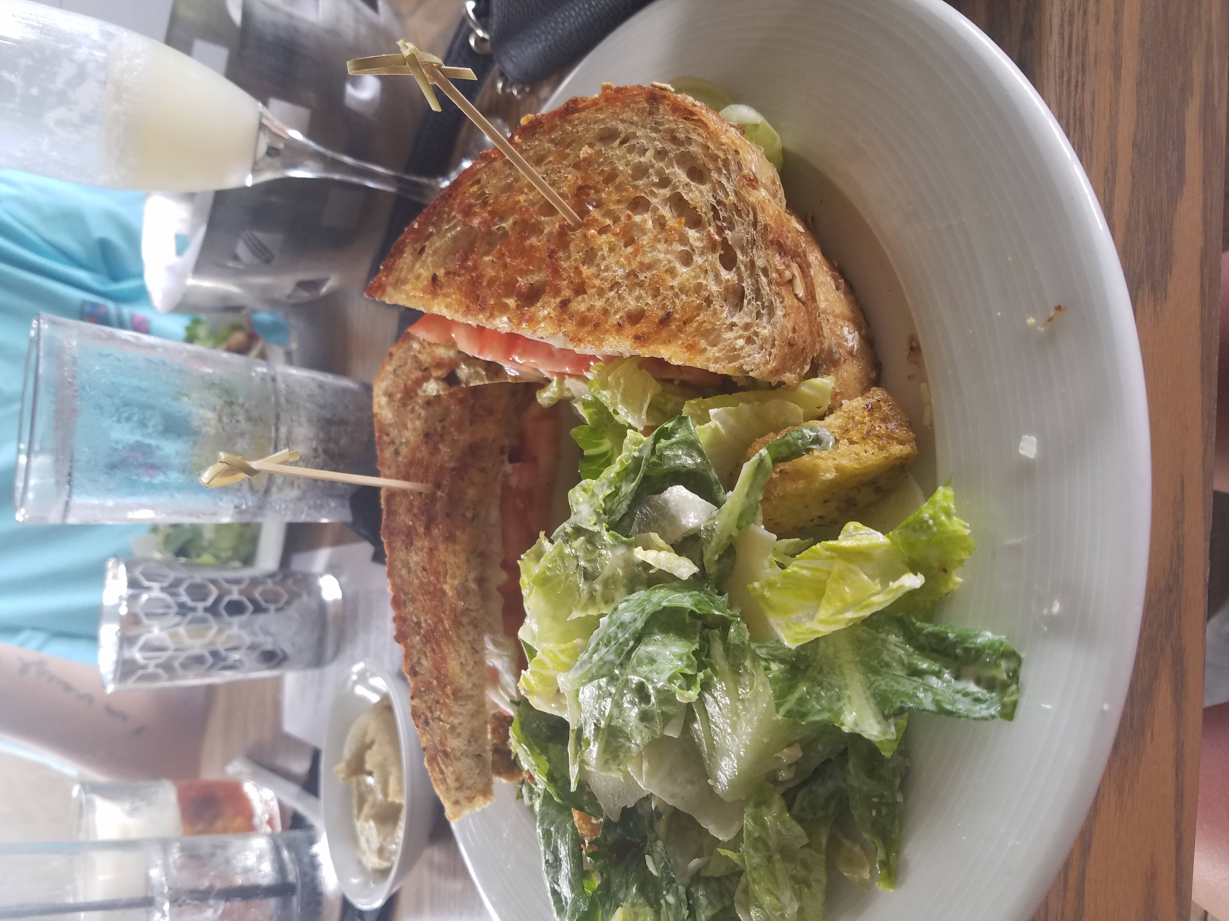 Sunday morning we had to check out by 11, but our flight wasn’t until 6:40. Our original plan was to sit on the beach all day, but being super sunburned, that wasn’t going to happen. We decided to go to a waterfront brunch at a place called GG’s. I decided to try a pina colada mimosa and their chicken club sandwich with a Caesar salad. Yep, I ate a salad, and it was probably the best salad I have ever eaten–https://ggswaterfront.com/. However, I have decided I am not a champagne person. I have tried it a few times, in a few different forms—mimosas, fall mimosas, just champagne, and I don’t care for it.